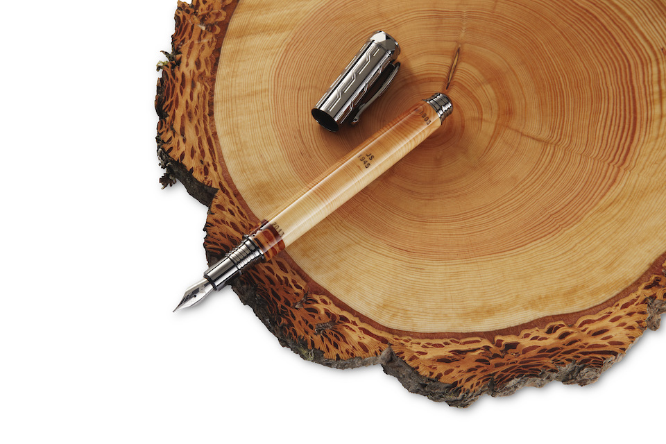 Each Tree Ring pen is crafted from a slow growing Douglas-fir tree and shows at least a century of annual rings. Each year engraved on the pen corresponds to the year the wood formed in the tree used to craft it. Pens are available as ballpoint, rollerball, and fountain. Fountain pens are crafted with black titanium plating and feature German made JoWo Berliner nibs, one of the world’s best steel nibs.
