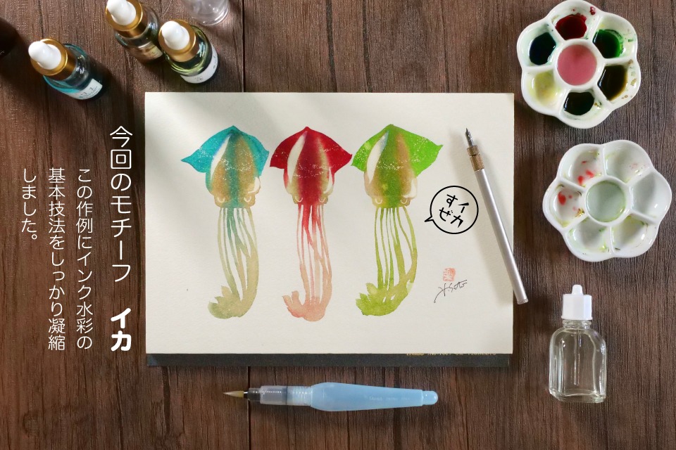 万年筆インクで絵を描きます。初心者歓迎、絵心不問。はじめてインクで絵を描いたり、ひさしぶりに絵を描いてみたい方に向けて組んだプログラムです。インクで絵を描く本当の基本技法で、イカしたイカを描いてみませんか?ご自身のインク遊びの幅がきっと広がります。道具はすべてこちらでご用意、手ぶらで起こしください。
