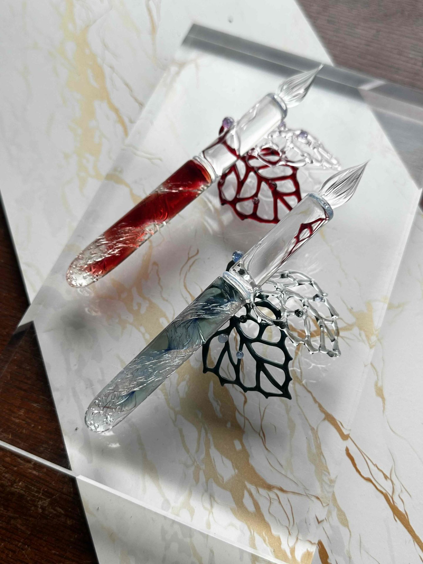 "色華硝子のガラスペンはガラス職人で培った高い技術によって細部までこだわって作られています。特に書き心地と握り心地は高い評価をいただいています。万年筆をモチーフにしています。実用的でガラスの美しさを引き出したコレクション性のあるガラスペンです。