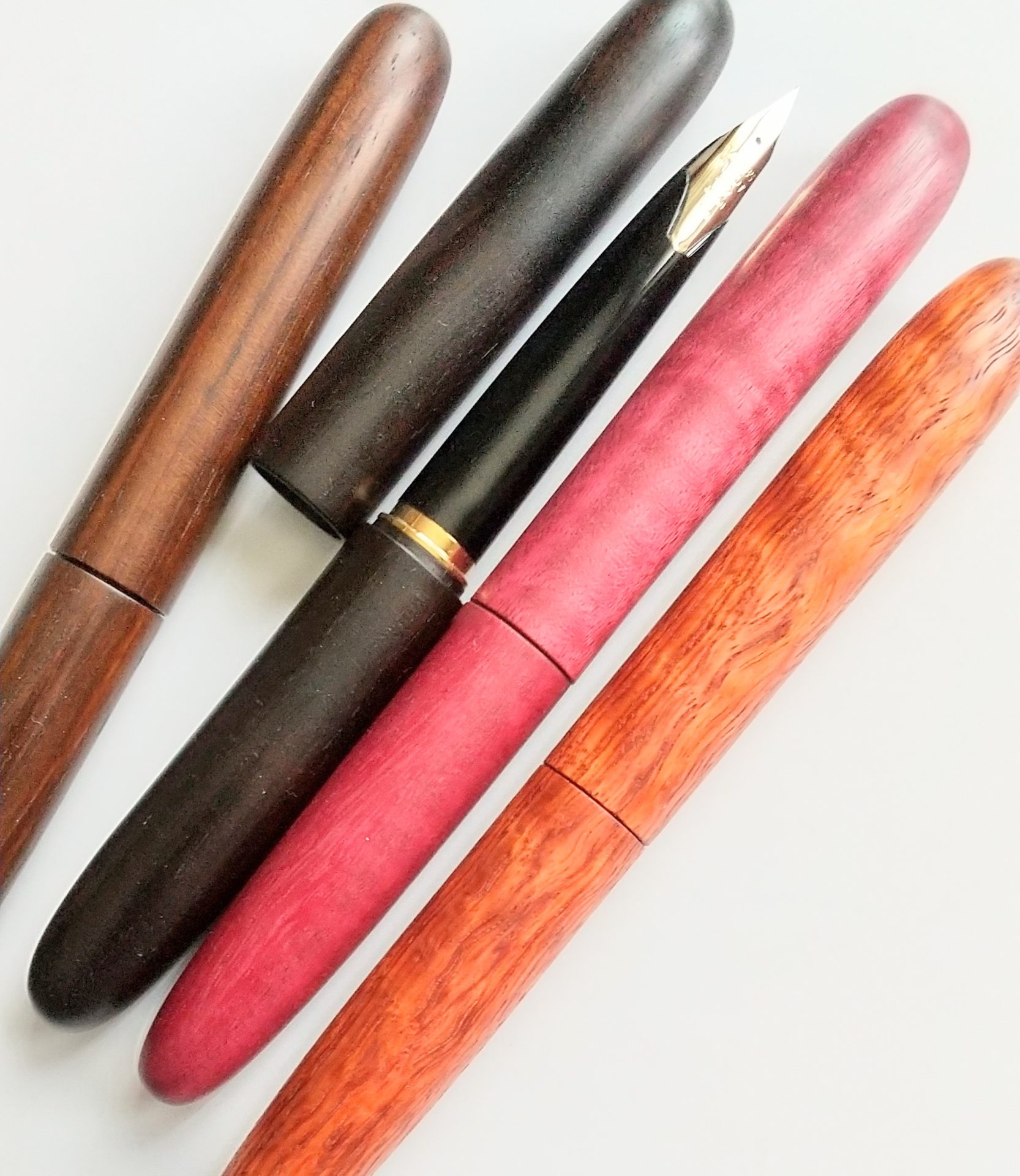 カリンのコブ、デザートアイアン、黒柿などの希少木で制作した万年筆。蒔絵、沈金、漆塗の万年筆。大型ペン先を装着した「シラネThe 21K」と「カザワThe 21K」は希少木で制作したものと蒔絵をご覧になっていただけます。